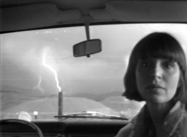When I look for the lightning, it never strikes. When I look away, it does. Filmed inside a car, this tape focuses on observation of natural phenomena, presenting the obverse of the, “If a tree falls in the woods…” conundrum. Does observation change the course of events? Can you believe in things you don’t see? In this experiment, the camera occupies a privileged position — showing the woman and what she sees, as well as what she cannot see. – Video Data Bank